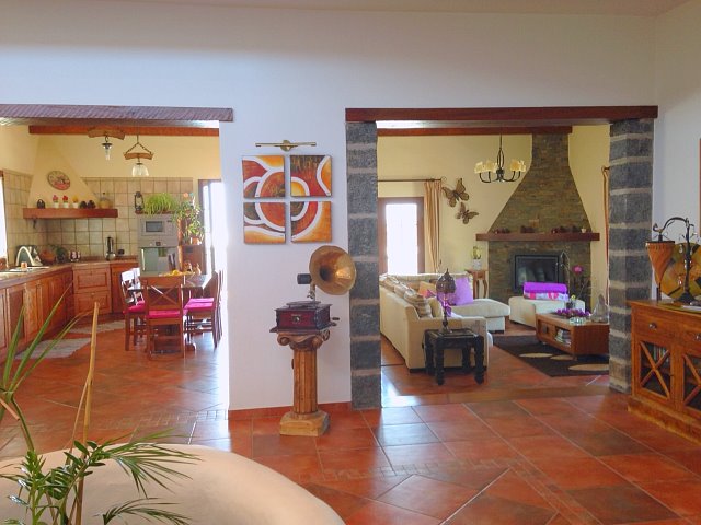 El gran salón es cómodo y acogedor, con una decoración sencilla y rural. También cuenta con un televisor de pantalla plana, y una chimenea. Conexión WIFI hay disponible dentro de la casa. La cocina, totalmente equipada, hace posible que aquellos que disfruten cocinando dejen volar su imaginación sin que les falte de nada. Está integrada en el comedor grande con su mesa en el centro. Ambas habitaciones se conectan directamente con el patio interior central.